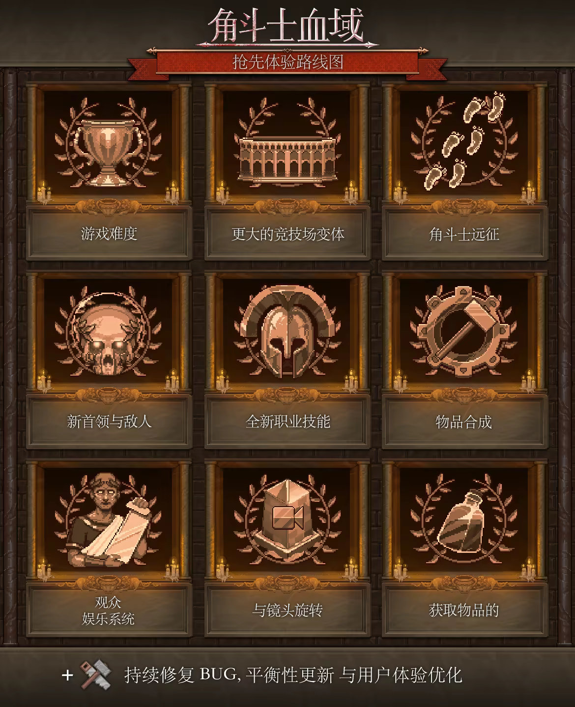 在两场战斗的间隙,用来之不易的金币修建城市里的建筑并升级,解锁全新工具与服务,为复仇之旅添砖加瓦。治疗角斗士伤势的医院、热闹非凡的市场、甚至还有纪念阵亡战士的宏伟纪念碑——每处设施都将成为你征途中的助力。