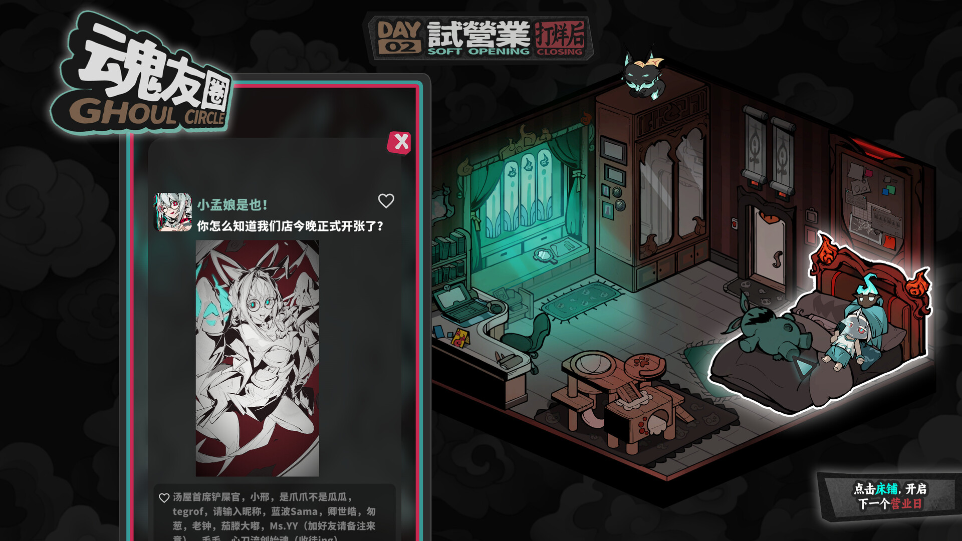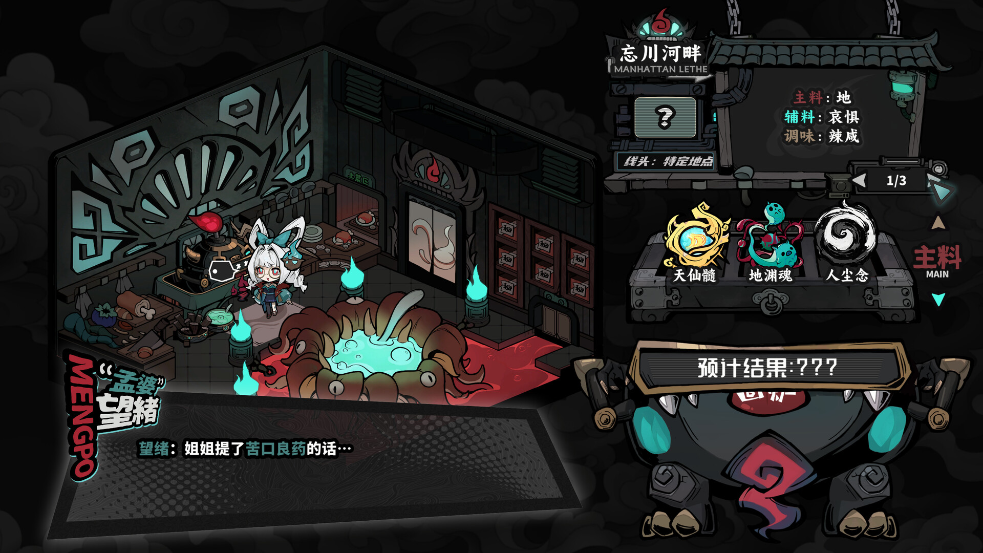 搞点鬼故事,整些阴间活。 中式阴间朋克 × 高浓度谐阴梗。 纯狱系调饮类视觉小说——欢迎光临《孟婆靓汤》! ·孟婆汤模拟器 扮演新任孟婆小孟娘,通过熬制不同的特调汤品,帮到店的客人们解决各式千奇百怪脑洞大开的遗忘需求——“通过遗忘抽烟的习惯来戒烟”、“遗忘被剧透的电影情节”、“遗忘偷听到的巨大阴谋”等等…… ·这是什么鬼?这是特色公务魂 基于中华鬼神文化的角色设计——典狱长“黑无常”、拘魂使“马面”、镇灵公“钟馗”、地府CEO“阎罗王”、值夜使“织影婆婆”、噩梦绘师“渊笔”、地府CFO“鬼母娘娘”……形形色色20+位阴间客户带着他们的特色遗忘需求光临汤屋,呈现阴间众生相,地府人情味。 ·地府,但是现代! 中式“阴间朋克”的美学设计,各种五彩斑斓的黑……谁说地府就得是阴森恐怖的? 18层经典再加20层“当季阎选”,地狱都更新到38层了?虚拟冥币、魂友圈、神工智能、深坟证、毒誓管理局……对喽!是时候更新你对地府的认知了! 欢迎加入Q群交流:653235036