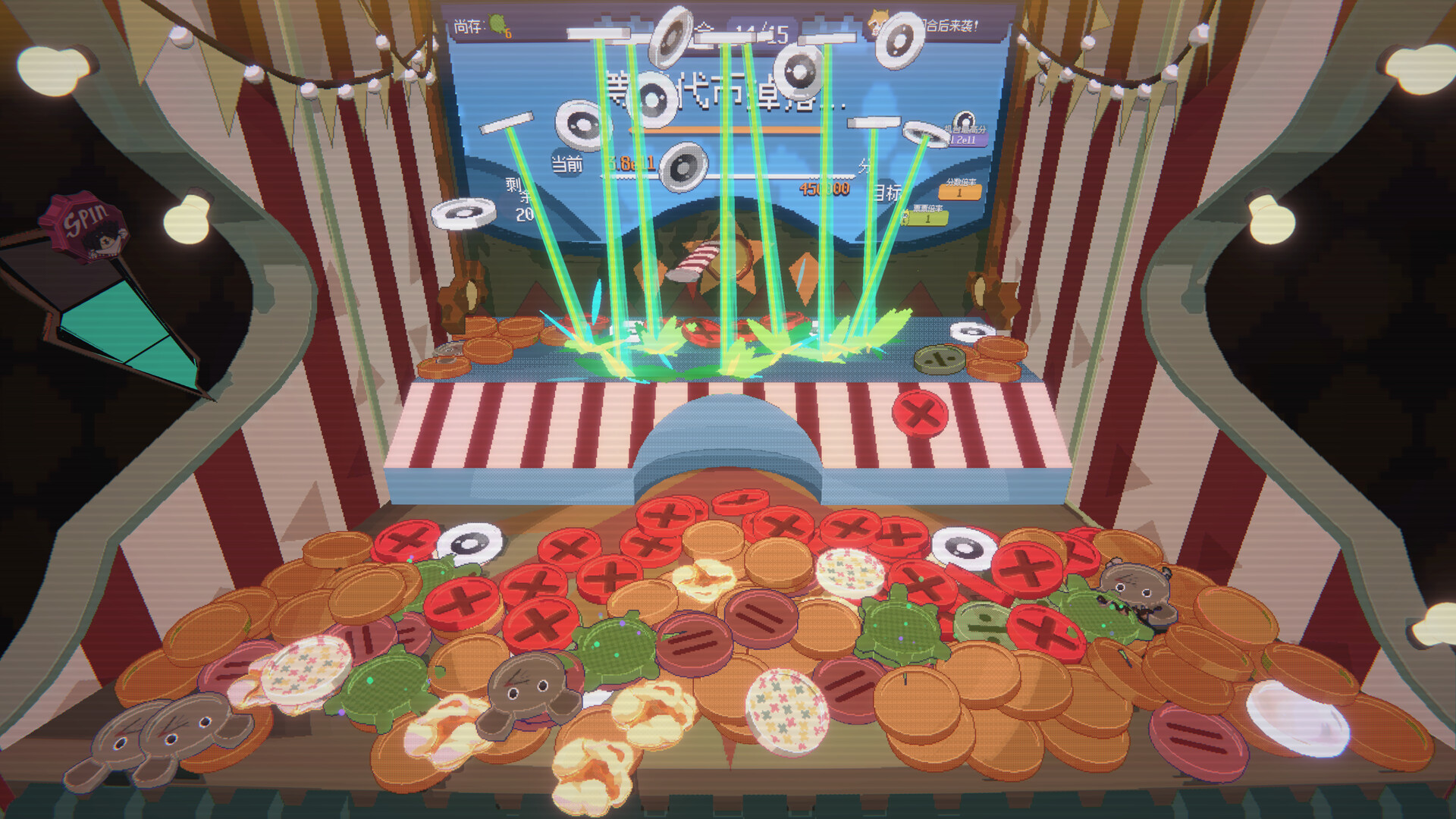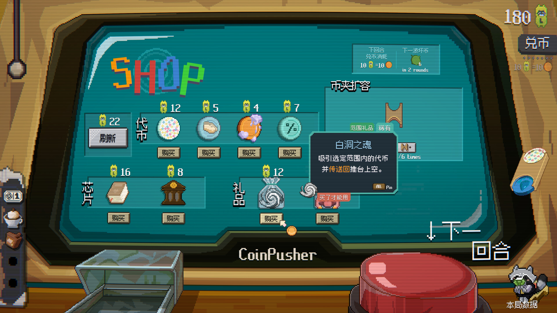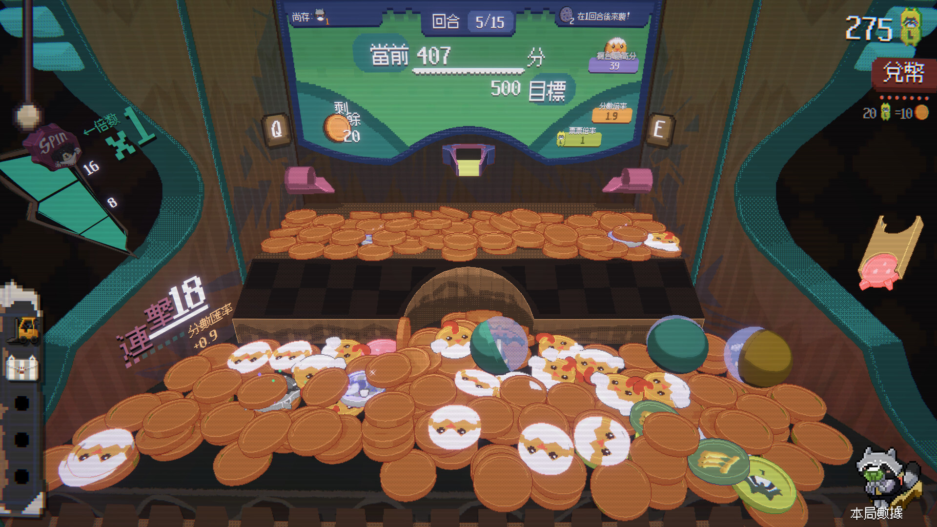 《浣熊推币机》将经典街机推币机充满混乱的乐趣与肉鸽卡组构建类游戏的元素巧妙融合在一起。玩家可以将特制币与强力道具组合来触发令人爽到爆的联动效果。这是一场令人停不下来的多巴胺盛宴,一段不可预测、金币纷飞的刺激旅程! 在冒险过程中发现各式各样的特殊代币!将种子币与水滴币组合在一起,就能在机台里长出一棵摇钱树。投下橘猫币可将鼠鼠币一网打尽,并额外获得大量奖券。想要更多分数?用加加币可全面提高你的得分。进度太慢了?发射核弹币引爆全场,一口气将所有代币炸向前方! 解锁超过 100 种独特的芯片,它们可大幅扭转对局走向。叠加倍率效果,生成带额外分数的代币,甚至在弹尽粮绝时猛摇整台机器,将代币都晃下来。 为你最爱的代币镀上特殊镀层,强化效果,解锁更加疯狂的连击玩法。 选择多位各具特色的角色,每位角色都拥有专属主题代币与独特玩法风格。你可以化身擅长利用数学来打出爆炸连击的贪婪浣熊经理,又或是专精动物和植物代币玩出奇招的古怪生物学家。每个角色都能带来新鲜且截然不同的游戏玩法。