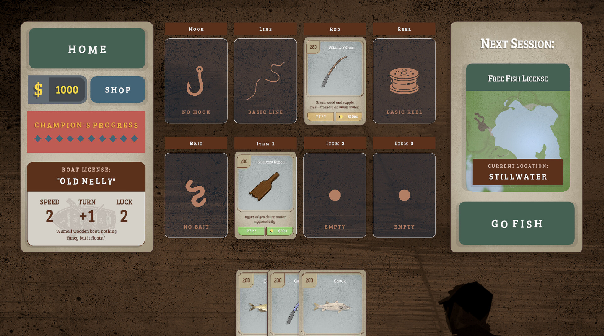 装备卡牌可通过商店购买或钓鱼获得,大量品类繁多的装备将加入你的钓鱼工具箱。从钓钩、钓线、鱼饵到渔线轮,从即时生效的特殊卡到稀有物品卡,每张装备卡都会增强或削弱你的钓鱼能力——无论是速度、上钩概率还是纯粹运气,在出发前往湖泊前都需要明智搭配装备。