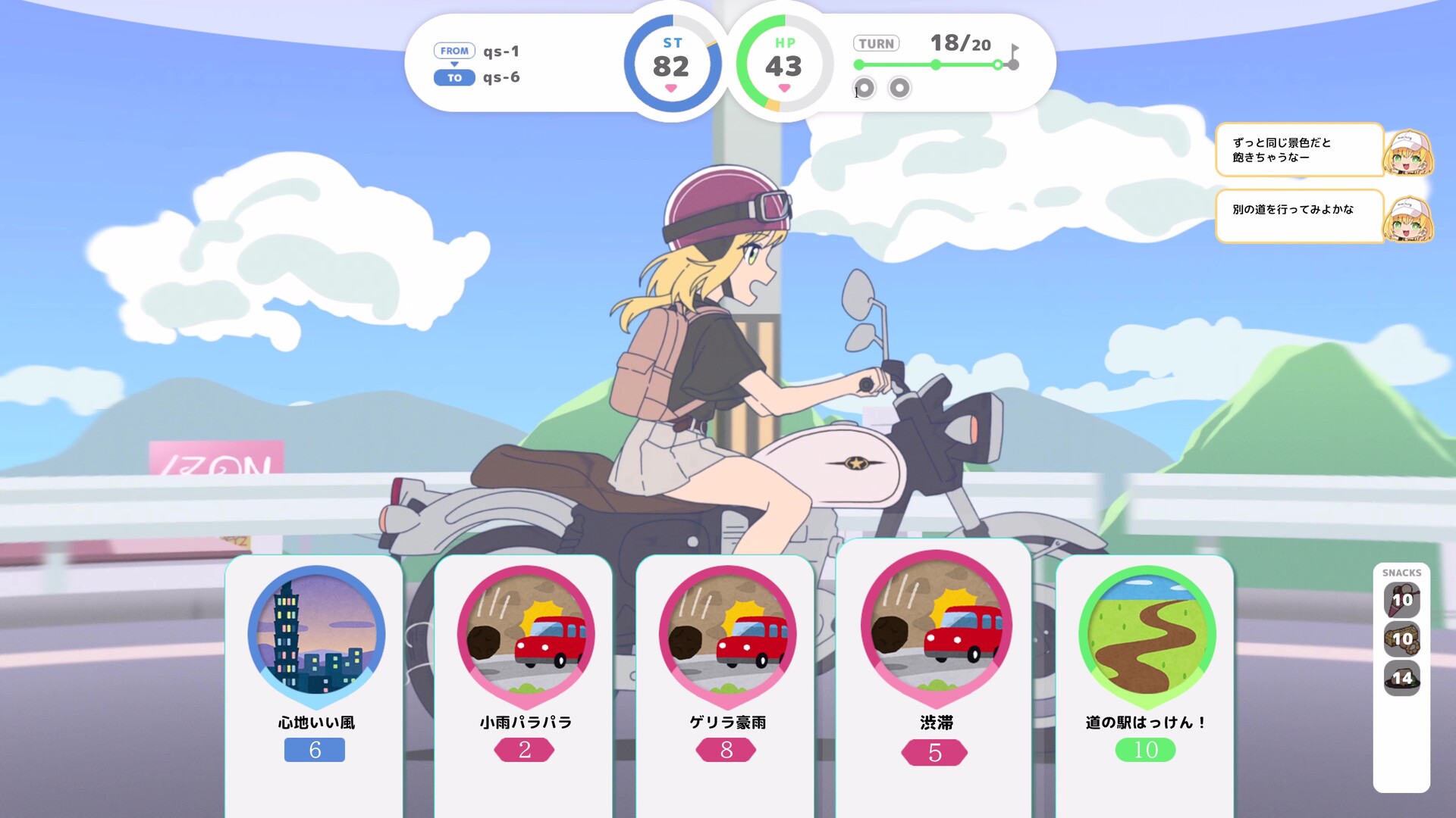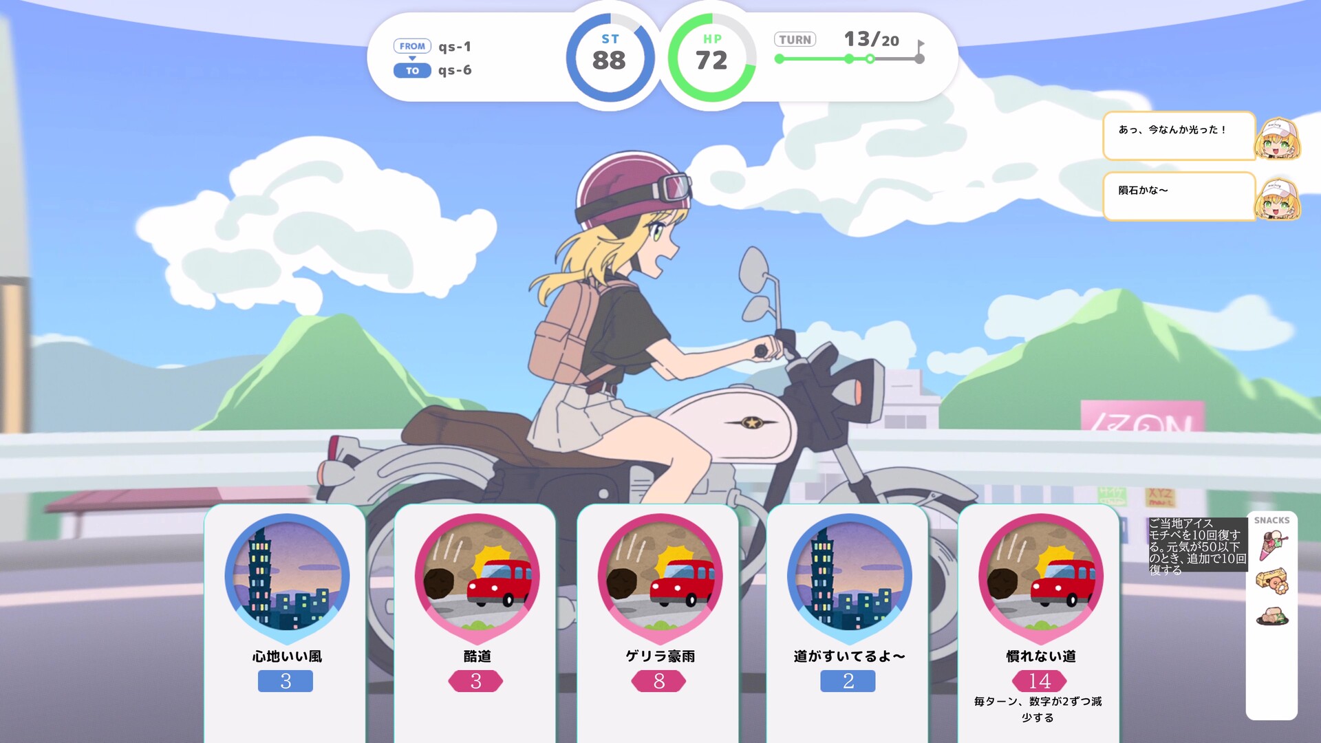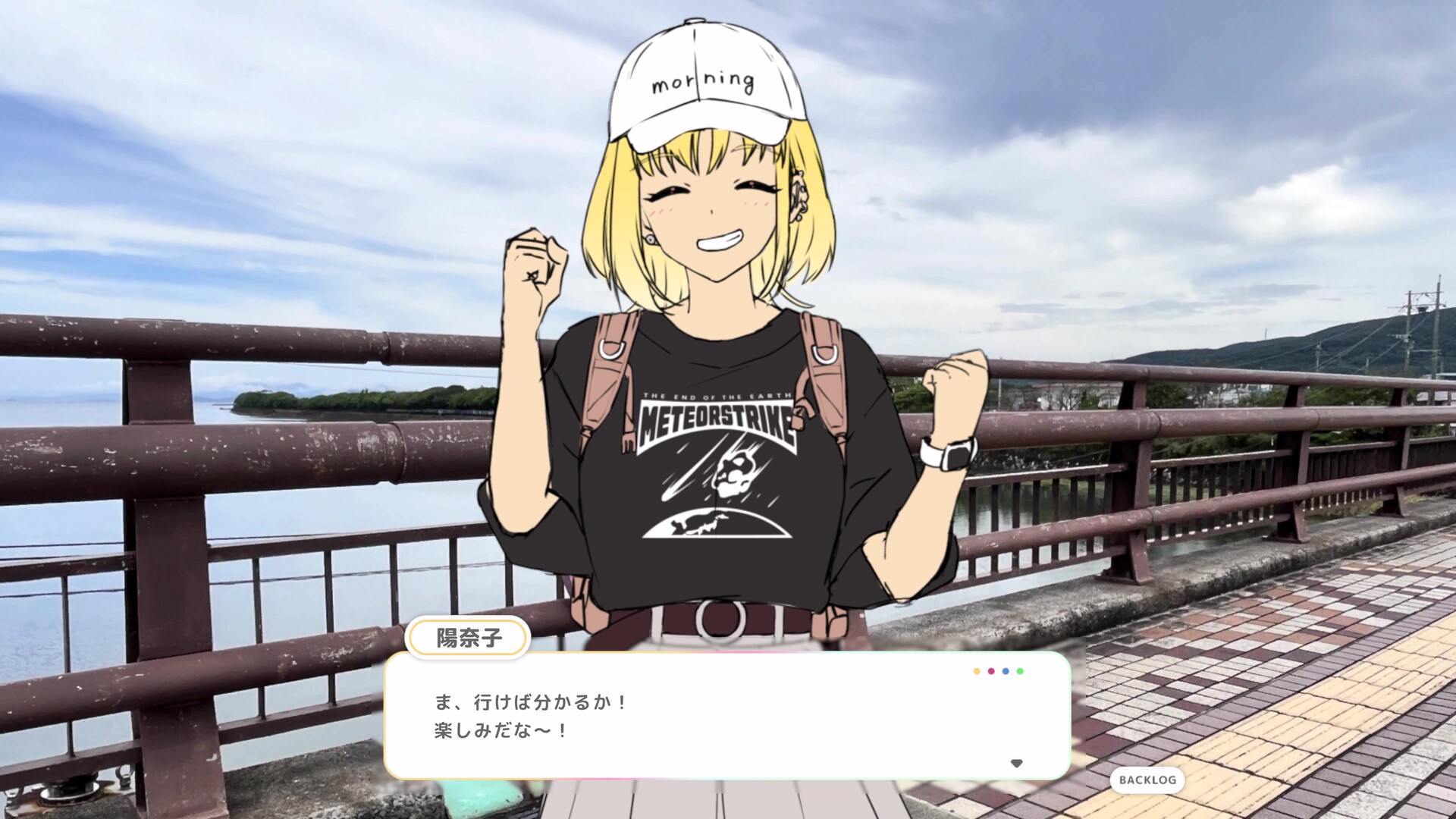 在这颗终将消逝的星球上,开启一段无比惬意的旅程吧—— 陨石即将坠落,世界走向终结。 在这则震撼的消息让全世界为之震动之际,女高中生大原阳奈子(おおはら ひなこ)做出了一个决定。 “反正世界都要结束了,不如横跨日本走一遭吧!” 性格开朗、极度乐观的阳奈子,骑上父亲传给自己的摩托车,从故乡鹿儿岛出发。 她的目的地是北海道——这个从她生长的九州地区出发,距离最远的地方。 旅途中,同行的伙伴会不断增加,想去的地方会逐渐变多,珍贵的回忆也会慢慢累积。 在这段无拘无束、随心所欲的旅程尽头,阳奈子她们会怀揣着怎样的思绪呢—— 这是一个充满治愈感的故事,讲述着尽情享受最后快乐时光的美好。 用卡牌漫步于终结世界的冒险游戏 本作是一款休闲向牌组构建型冒险游戏,描绘了在世界末日之际,少女们为横跨日本而踏上旅程的模样。 玩家的目标是在世界毁灭前抵达北海道,同时可以前往现实中的各类地点中途停留,收集道具并构建牌组,让攻略过程更加顺利。 请在有限的时间内合理规划行程,高效构建牌组,创造更多珍贵回忆,让这段旅程变得丰富而充实吧。 角色介绍 大原阳奈子(おおはらひなこ): 本作的主人公,梳着双马尾的活力少女。 原本是高中生,但由于巨大陨石逼近的危机,学校已停课。 她心想“反正如此,不如去旅行”,于是踏上了旅程。 赤坂爱依(あかさかめい): 在旅途中遇到的辣妹,目前是专科学校学生。 虽然是辣妹,却有着会照顾人的大姐姐性格,还藏着不为人知的少女心……? 三澄琉璃(みすみるり): 旅途中遇到的社长千金。 举止优雅却喜欢喝酒,喝醉后就会开始四处闲逛。 此外,她还是个路痴。 岛袋翠(しまぶくろみどり): 随心所欲的音乐人。 是阳奈子一行人在旅途中各处都会遇到的神秘姐姐。 制作者简介 aozorite 日本的独立游戏制作团队。 主要由创作者服务器“Velocity,”的成员组成。 团队聚集了跨越游戏开发者、插画师、小说家、程序员、影像创作者等领域开展活动的创作者,他们凭借各自的专业能力与感性,以独特的方式推进游戏开发。