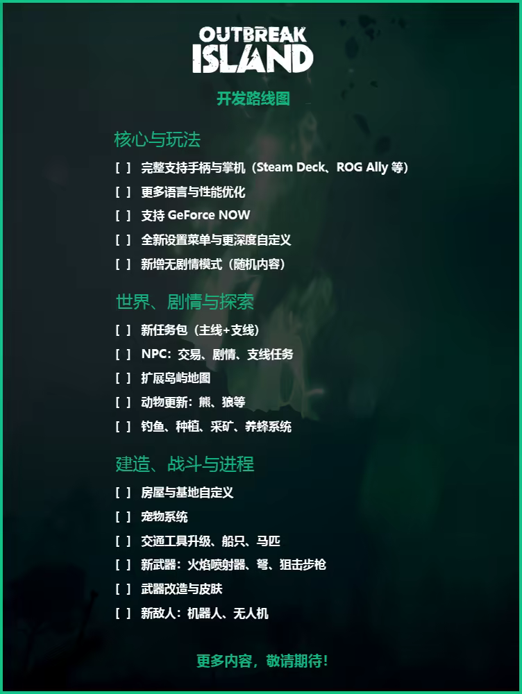 为何要采用抢先体验这种模式? “我们是一个小型团队,正在开发一款融合了多个相互关联的系统和精心打造的世界、氛围独特的游戏。 对我们而言,确保我们朝着正确的方向前进至关重要——这包括游戏操作手感、探索、生存和故事讲述之间的平衡。 抢先体验让我们能够收集实时反馈,了解玩家真正喜欢的内容,并明确需要改进或扩展的地方。” 这款游戏的抢先体验状态大约持续多久? “我们计划在2027年初左右发布游戏的完整版本,不过这个时间表可能会根据开发进度和社区反馈而改变。 如果玩家提出的想法或功能需要更多时间来实现,我们已准备好进行调整——我们的主要目标是交付尽可能最好的游戏版本。” 计划中的完整版本和抢先体验版本到底有多少不同? “我们计划随着开发的进展,逐步扩展岛屿的可探索区域。 在抢先体验版本中,玩家将能够探索大约三分之一的岛屿。随着时间的推移,新的区域将会开放——每个区域都会引入新的任务、活动、制作选项、机制和独特的敌人。 我们还打算改进核心系统,例如生存、进度和世界互动,并通过新的事件和支线故事来丰富剧情。 在首批重大更新之后,我们将公布一个公开的路线图,以便玩家能够跟踪开发进程和即将到来的功能。” 抢先体验版本的现状如何? “目前,您可以体验游戏的前三分之一内容,熟悉核心的生存机制、探索和故事开端。 您抵达神秘的‘疫区岛’,这里每晚天空都会出现一道绿色的光柱——唤醒奇异而危险的生物。 当前版本包括: 可供探索的岛屿的前三分之一区域。揭示岛屿故事的主线任务。修复您父亲废弃的农场并将其作为基地的能力。跨越不同生物群系的 5 种敌人。用于升级车辆的车库。用于制作和改装武器的武器工作台。用于解锁新技能和制作配方(超过 20 种物品)的研究台。用于定位补给箱(装有稀有战利品的特殊容器)的无线电信标。超过 25 个大型兴趣点,每个都有其独特的任务。基础的耕种、木工、金属加工、狩猎和钓鱼系统。” 在抢先体验期间和结束之后,游戏价格会有所不同吗? “是的。随着游戏内容的丰富——包括更多内容、功能和改进的游戏玩法系统——价格将逐步提高。” 在开发过程中,你们是如何计划让玩家社区参与进来的? “我们通过 Discord 和 Steam 讨论区与我们的社区积极沟通。 您的反馈、想法和建议帮助我们确定优先事项,并使游戏变得更好。我们密切关注玩家的意见,并与您一同塑造《疫区岛》的开发方向。”