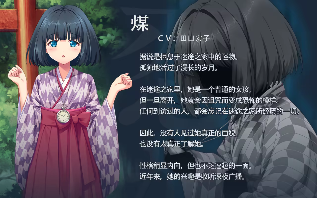 由Nekoneko Soft与OVERLAP GAMES倾情制作 - 一段略带忧伤的传奇物语 游戏时间为10小时左右。 没有复杂的操作,基本上只需推进故事情节即可! 角色原案由《Christmas Tina》的Werkbau担纲, 剧本则由《Narcissu》的片冈智精心编写。 通关故事后,还搭载了画廊模式,可供欣赏为故事增色的事件CG! 请务必享受这高品质的故事体验! 类型:ADV 标题:【终有一日愿遂思恋】~来自迷途之家的信笺~ 不爱红尘误 偏得命苟延 "今宵何所恋 夜半月中天 (三条院 百人一首68)" 舞台:仍残存于现代的迷途之家(まよいが) Q:为什么这一存在无人知晓? A:无从得见。 其位于山间偏僻之地,通常被湖水淹没。 A:无人接近。 山脚下的村子里,流传着与其相关的恐怖传说。 A:终将遗忘。 离开迷途之家后,所有的记忆都会被遗忘。 那是距今约50年前,时值昭和47年(1972年)的故事。 作为高中生的主人公动身前往祖父母的故乡, 开始了为期一夏的短途旅行,这也是每年的惯例。 与妹妹结伴而行,本应和村民们共度平静悠闲的日子…… ——不能进入山中,诅咒会降临。 村子里似乎流传着这样的传说。 人们相信山里住着怪物,若是不期而遇,变会遭逢诅咒。 “在火箭飞向月球的时代,这种迷信真是荒谬。” 虽然主人公完全不信这些,但他却另有隐情。 他曾亲眼看到过那个怪物的栖息地。 那不过是个破旧的神社。 于是,他毫不犹豫地再次前往那个禁忌之地。 走进大山中,路经一片被野草覆盖的鸟居。 最终,他再次见到了从湖面浮现的那座破旧神社。 毫不犹豫地走进神社后,却心生疑惑: ……为什么我以前没进来过呢? 既然都已经来到这里了,理应进去才对, 但他却发现自己完全不记得当时的事情。 “你好像长高了一点吧?” 不知从哪儿传来的声音。 而他认出了那个声音的主人。 准确来说,是他进到这里后,“现在”才想起来的。 “……从那时起,已经过了多少年了?” “5年又3天。” 1827天后,我们再次重逢。 没有询问彼此的名字,记忆里早已知晓对方为何。 然而,这份“记忆” 却并非是能永久保留之物…… ■角色介绍 ■制作人员名单 角色原案协力:Werkbau/苏泽睿 原画视觉:秋乃武彦/Ankoromochi 剧本:片冈智 背景美术:KyaruMii/Miyoruno Yumeji CG上色:朝葱红叶/伊地山 SD图像:Hikanyan 音乐:PROJECT LIGHTS LOGO设计:木绪那智 UI设计:KOME WORKS 程序:和泉八郎 制作人:上冈 忠史(OVERLAP) 助理制作人:寺井领一(OVERLAP) / 梅崎友一(Three Waves) 导演:片冈智 特别协作:Nekoday/YAMAYURI GAMES 游戏制作:Nekoneko Soft
