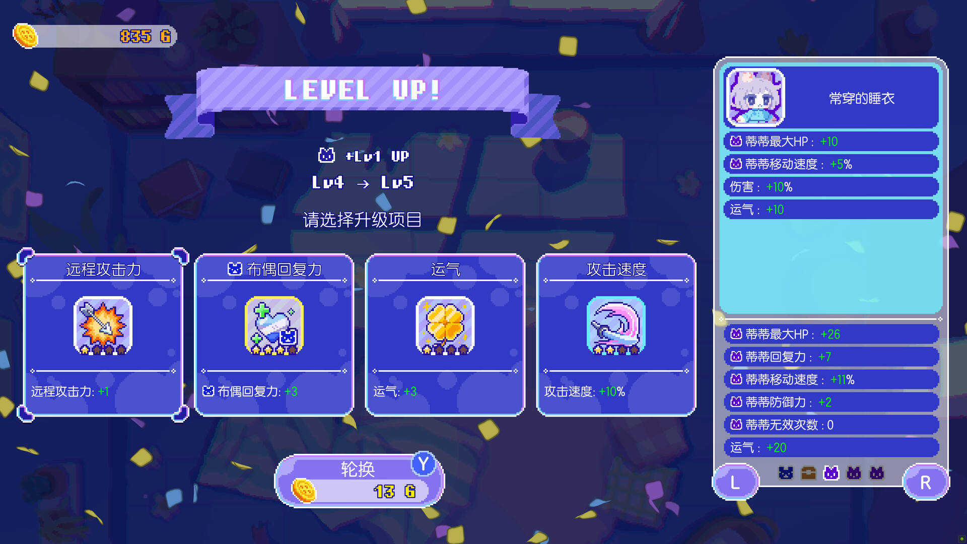 我渴望一场永眠,相信你也是如此。 『月下梦景』是在鬼怪的追逐下展开的捉迷藏式动作游戏。与富有个性的布偶们齐心协力,逃离难以成眠的夜晚吧。 夜幕下相识的神秘少女 由于鬼怪们在梦中的骚扰,名为「蒂蒂」的少年已经不知度过了多少难寐的夜晚。但某天夜里,在突然出现的少女「露娜」的指引下,他开始率领拥有神奇力量的布偶们一起消灭鬼怪…… 强大又可爱的布偶们 蒂蒂无力与鬼怪战斗,能做到的就只有逃命。但是,跟随在蒂蒂身后的布偶们却拥有消灭鬼怪的力量。布偶们风格各异,有的会冲上去近身交战,有的会在远处发射子弹,也有的会给同伴们疗伤。请在多达40种布偶当中寻找合你心意的布偶,组成团队一起保护蒂蒂吧。 -迷你仓鼠 不安分地到处跑来跑去的小型布偶。用灵活的双手挥动树枝,对鬼怪展开攻击。 -沉睡长颈鹿 有些魂不守舍的布偶。可以令被攻击命中的鬼怪移动速度暂时低下。 -天使斑斑 对疲惫的人关怀备至的善良布偶。可以从远处回复蒂蒂的HP。 靠购买道具打造无敌战术 顺利摆脱鬼怪的追杀后,便可以用获取的金钱购物。除了招募新的布偶,也可以购买各种道具。只要持有就可以给蒂蒂和布偶带来许多好处。但道具当然也各有弱点,需要权衡其是否符合战术需要。登场道具超过100种,你能否将它们集齐? 穿上漂亮的衣服挑战无限 「看到故事的结局了!」……很抱歉,那只是游戏的起点。蒂蒂可以更换超过20种服装,有一些可以大幅强化布偶,但也可能换来致命性的弱点。试着将各种布偶与道具搭配在一起,穿上所有服装战胜恶梦吧。 -月夜的魔法使 远距离攻击力成长较快,可以组建仅由远程型布偶组成的战队。防御力成长较慢,需要尽量从远处消灭鬼怪。 -浅眠浮云 伤害的成长速度较慢,但可以让不移动的布偶获得2倍的攻击速度。尽量让更多碉堡型布偶加入战队吧。 -与狗狗同行 只有狗狗布偶可以加入战队。关键在于如何发挥出复活速度较快的优势。