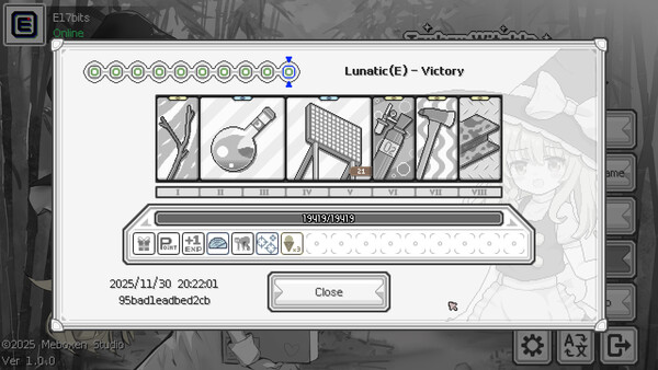 欢迎加入Q群1062830120进行讨论! 魔理沙将自己所有的魔法道具都卖掉换钱,但还是在“怕亲哥”里输的一分不剩! 偷遍了幻想乡的魔理沙遭到不明人物的追杀,不得不加入到最近流行的魔法道具战斗中…… 但是,魔理沙是不会放弃的! 凭借对魔法道具的优秀直觉(以及灵梦充满恶意的贷款),她将在战斗中打倒一切对手,并把抢来的钱全部用于还债! 可是,如果在对战中失败,迎接魔理沙的恐怕就不是什么好事了…… 游戏玩法 你将扮演魔理沙,在十天之内搜集各种物品进行组合,并使用这些道具迎接夜晚的战斗! 在大约20分钟的完整对局中,你将进行多次的选择,并逐步形成自己的构筑。 最终,你将会受到敌人的无情考验,若是没能取得胜利,就要接受惩罚…… 物品和技能 游戏拥有125种物品和48种技能,可以让玩家自由组合! 每一局游戏,你可以获取的物品与技能都不尽相同,尽情发挥想象力,组合出各种强力的阵容! 事件选择 每天你可以选择三次事件,事件可以让你购买物品、获得技能,或者增加经验等。 一些稀有的事件还能让你改变物品的效果,从而开发出连制作组都未曾设想的道路! Extra模式 觉得预设的敌人不够劲?开启Extra模式,可以让你的历史记录变成你要面对的敌人! Extra模式还可以导入其他人的游戏数据,把你的存档发给你的朋友,让他们感受下你的构筑! 除此之外…… 你可以自定义战斗时的背景!将自己喜欢的贴纸放在上面作为装饰吧! 还有许多小秘密等着你去发现! 欢迎加入Q群1062830120进行讨论!