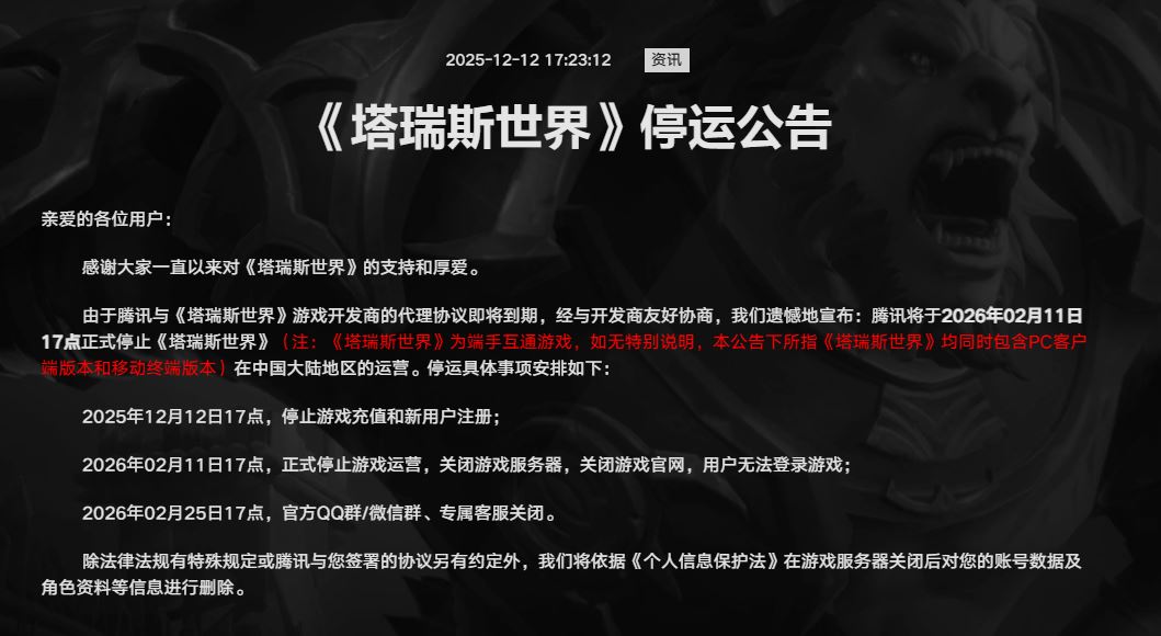 北京时间今晚,腾讯宣布:《塔瑞斯世界》将于2026年2月11日17:00终止运营,公告发出的同时游戏的充值、新用户注册功能已关闭。