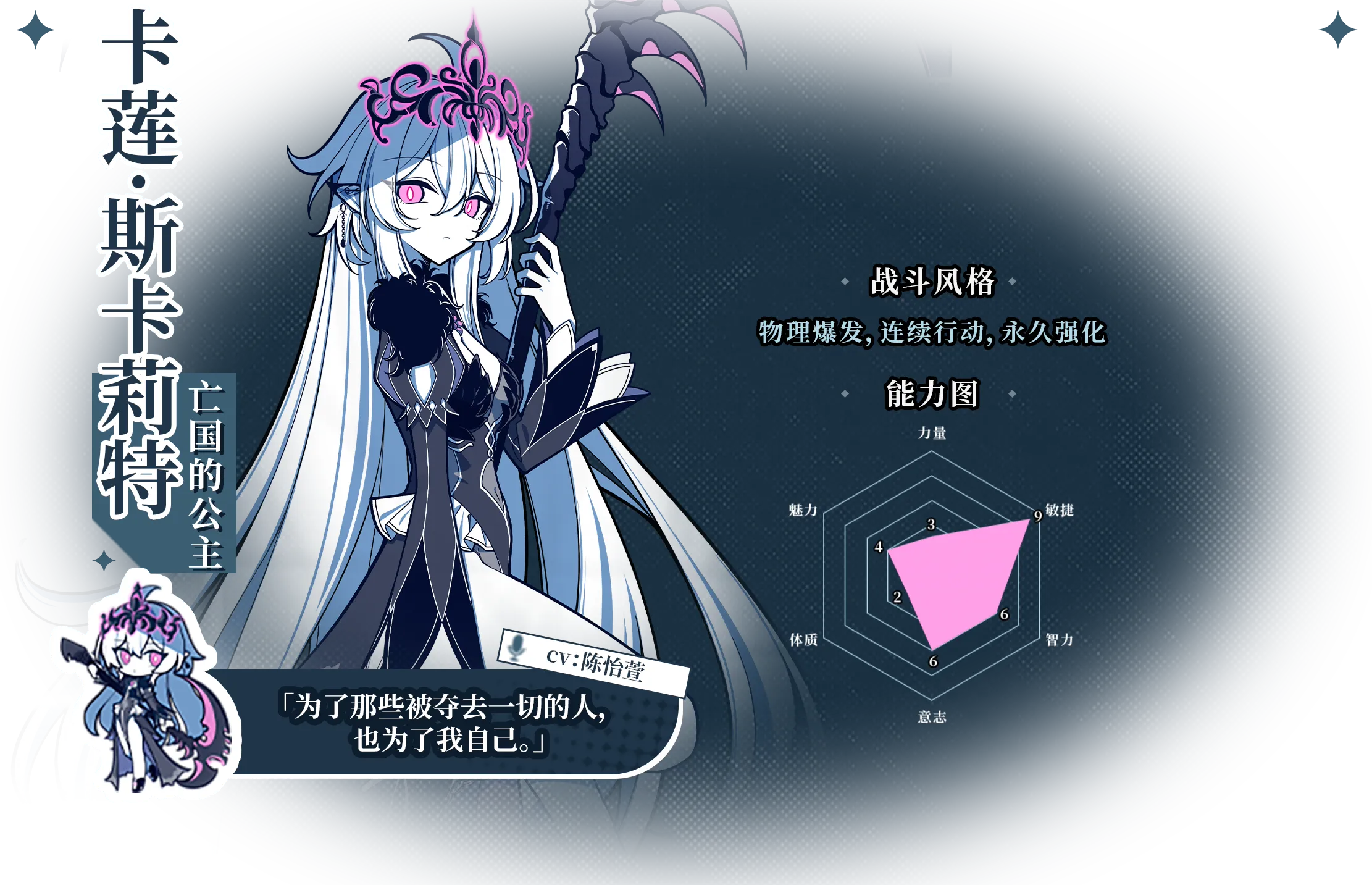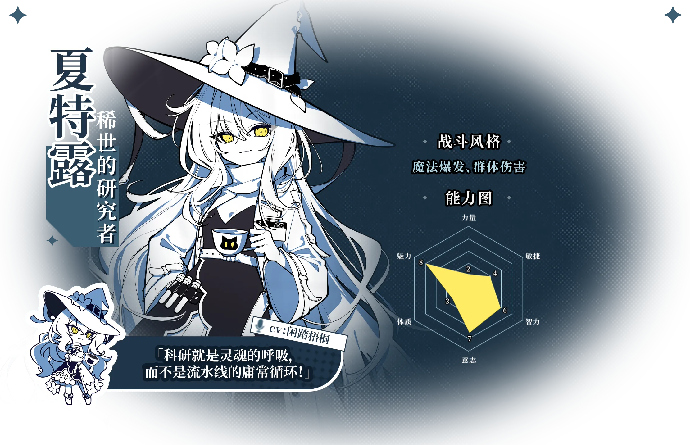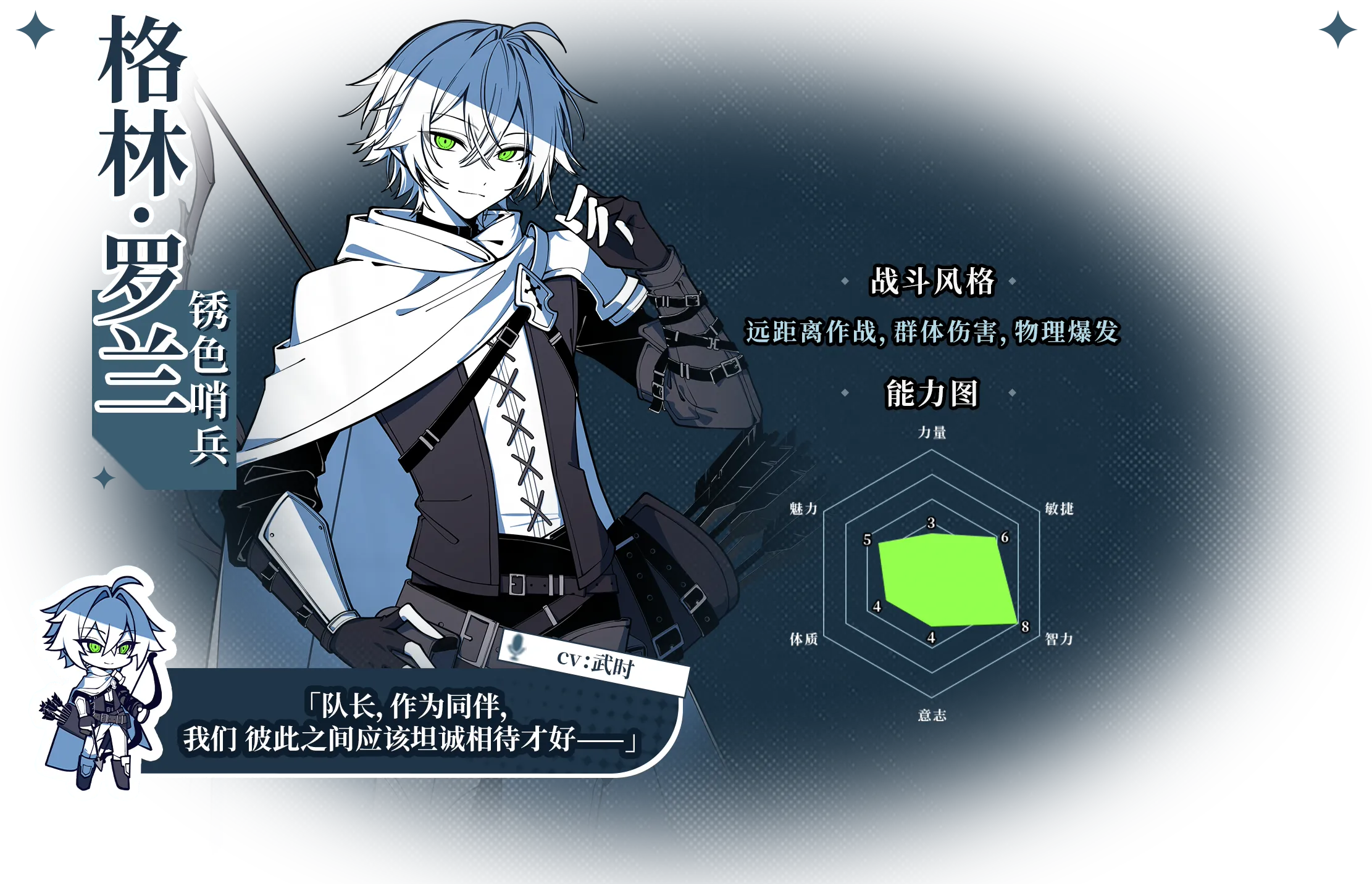 这是你和她未竟的故事,这是属于「你」的旅途……于银葱之森中苏醒的你,开始踏上寻找「逐梦者」秘密的道路。 各大势力的阴谋在水面荡出涟漪,而黑雾则潜藏在更深处暗流涌起。 建立羁绊或播撒仇恨,见证「你们」和「银葱之森」的结局。 公会冒险每一位冒险者都离不开重要的伙伴。 你将成为公会的领导者,和同伴一起规划冒险之旅,在银葱之森写下你们的逐梦篇章。 日程管理冒险者,今天我们要做些什么呢? 是与同伴们一起训练,还是前往深邃的迷宫?亦或是接下黑市商人那不可告人的委托? 决策导向你的每一个选择和决策都可能彻底改变这个世界的走向。 只是,你的能力真的可以支撑你做出这些选择吗? 个性化成长与管理每一位角色都拥有6个维度的数值,以及其独一无二的技能模组及分支。 你可以影响每一位角色的成长路径和装备,最终率领一支极具个人风格的精英冒险者小队。 策略与战斗波灵,哥布林,暗杀藤……银葱之森危险重重, 搭配你的技能与队伍,然后率领他们与数十种不同的敌人进行战斗。 银葱之森的神秘小姐姐,是一位略懂些魔法技艺的剑士,自称要打败魔王赢得众人的欢呼——不过目前的当务之急是抢购打折面包。 「我叫莉莉丝,一名魔剑士——在商业之里,像你这样的好人可不多了。」 虽然她嘴上说着「好巧」,但似乎已经在这座广袤的森林中等待你许久了——不过这么说好像又有些自恋——也许真的只是「好巧」吧。 在吹灭15岁生日蜡烛之前,卡莲无疑是这世界上最幸福的女孩——一对疼爱她的父母,城堡里的巨大卧室和爱戴着她的王国子民。 直到那天,她许下了一个离开城堡的愿望,跟随着一只蝴蝶走进了森林。再次回来时,她的王国已被一团团黑雾包围,变为人间炼狱——来不及痛哭流涕,一切就已被一场大火焚烧殆尽。 从那之后,卡莲的笑容便消失了,取而代之的是一把锋利的镰刀和一颗复仇的心。 「自求多福吧,我不会再救你一次了。」 卡莲转身便没入了黑暗——为了找到那天消失烈焰中的神秘人影,她不得不扼杀自己的情感。 每天24h工作制,睁眼就是「坚持魔王所领导的新时代魔王军,推进魔物现代化」的例行会议,还要定期对魔王军破坏行动进行等级评定。弗子一度厌倦了自己的生活。 她放弃了作为魔王的职责,本以为可以就此过上无忧无虑的流浪生活,但接任者拉哈蓓的黑暗统治让她对自己的决定陷入了深深的自责。 为了弥补自己的错误,为了阻止这场旷日持久的战争,她作为前魔王,必须要讨伐魔王。 「原来如此,积跬步,至千里……勇者,你已经考虑如此细致了。」 弗子自然找到了自己的勇者,因为她早已看到了这位勇者无数次击败拉哈蓓的未来。 作为从小就在赞叹中长大的「真理之桥」,夏特露的人生无疑是一帆风顺的。过于年轻的才能会受到来自上位者的质疑与嫉妒——那些研究所里的老学究认为夏特露的研究不过是外强中干的空中楼阁。于是无数揶揄与指摘纷至沓来,应付这些社会舆论严重拖累了夏特露的研究进度。 她不想将自己的生命浪费在与平庸之辈的喋喋不休上,于是她抛开一切束缚,主动放弃了第九研究所的工作,她需要大量的时间不停计算与推演,直至「创世大魔法」的完成。 「我突然对你感兴趣了,你就来做我的研究对象吧!」 不过,她似乎又被什么新奇玩意吸引注意了,通往大魔法之路何其漫长。 「打败魔王,成为英雄」是格林自年幼以来的梦想。自8岁的格林第一次在皇城阅兵会上看到萨提尔将军的英勇身姿后,他便暗暗立下了加入银色格里芬的目标。 作为最年轻的格里芬情报对策科探员,格林罗兰成为了备受期待的新星,然而一次任务中的「意外」,却让他身受重伤,再次恢复意识时,他便受到了被军队除名的通知。 没人知道那天究竟发生了什么。格林·罗兰依然如平日般穿梭于市井,今天他有了新的身份、新的目标。 「在下格林,在这片林子里讨生活的猎户。」 从那天起,格林便已决定踏上这条荆棘之路。 这是你和银葱之森的故事银葱之森,这是一处轻语着魔法的世界。生灵在此展现光怪陆离的形态,阴谋在暗影中编织成网,你将身处一段爱恋,一次旅程,一处悬而未决的选择。 当然了,这也是属于「我们」的,独一无二的故事……