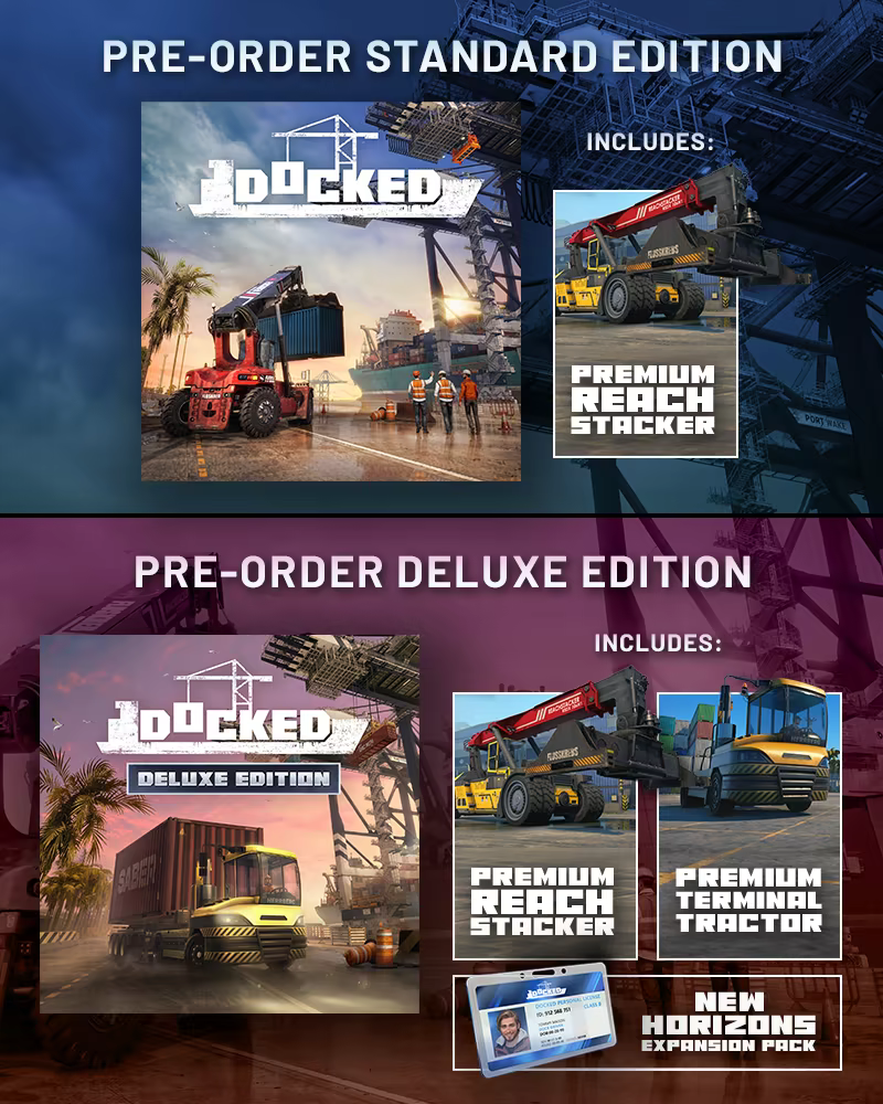 预购《Docked》豪华版即可获得高级正面吊运机,这是一款随时可以切换的时尚现代化车辆。尊享与众不同的三色车身涂装、强化的发动机、更快的加速和制动,以及速度提升 15% 的起重臂。 豪华版包含基础版游戏以及"新视野"扩展包,该扩展包将解锁2026年春季推出的DLC 1和2026年夏季推出的DLC 2,其中包含新机械、额外里程碑(每个里程碑都附带各种新工作)以及多项基础设施升级,助您扩展业务。 玩家还将获得一款专属车辆——高级版本的港口牵引车,它拥有现代化的设计、独特的彩色涂装、时尚的图案以及特殊的上下车动画。这款升级版的主力座驾专为脱颖而出而设计。其强化的柴油发动机(7.15升,230马力)能提供更快的加速度和更强的制动力,带来更平稳、更高效的操作体验。