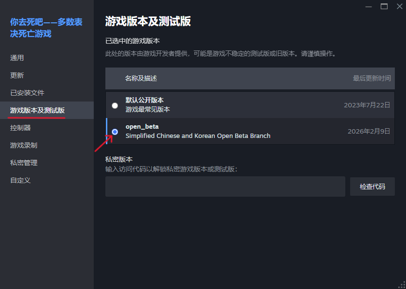 简体中文 & 韩语 Open Beta 现已上线 https://store.steampowered.com/news/app/2067780/view/510730583362504204 我们很高兴地宣布,全新的 “open_beta” 分支 现已开放,正式加入简体中文与韩语语言支持。 本次更新 不包含任何游戏内容或剧情方面的变更,仅用于实装官方游戏内翻译。 此前,这些翻译需要通过玩家制作的外部补丁进行使用。现在,我们已将其正式整合至游戏本体中。 由于该版本相比默认分支可能存在一定程度的不稳定性,因此目前以 “open_beta” 分支 的形式提供。 翻译人员名单: 简体中文翻译: yiki, 缺缺氧, 织织, Ash, 冬眠, 又竹, 裤子, Aki, 海星, 三月兔, 奇异果, 川川 韩语翻译: 탄산커피, NIHAN, 아마도딜로, 햄키 我们衷心感谢所有为本次翻译付出努力的人员。希望本次更新能让更多玩家体验到 Your Turn To Die 的魅力。 感谢大家一直以来的支持。 关于本次 Open Beta 新增简体中文与韩语语言支持不包含任何游戏内容、剧情或玩法改动稳定性可能略低于默认分支 如何参与 Open Beta 打开 Steam 游戏库、点击 "⚙" → "属性" 进入“游戏版本及测试版”选项卡、选择 “open_beta” 分支 安装完成后,可在游戏内 Options(设置)菜单 中切换语言 我们将持续改进游戏,让更多玩家能够享受 Your Turn To Die。再次感谢您的支持。 如需获取最新资讯,欢迎关注 0UP GAMES 官方账号! 同时也欢迎关注 Nankidai-sensei 的官方账号,那里发布了许多精美插画,强烈推荐查看!