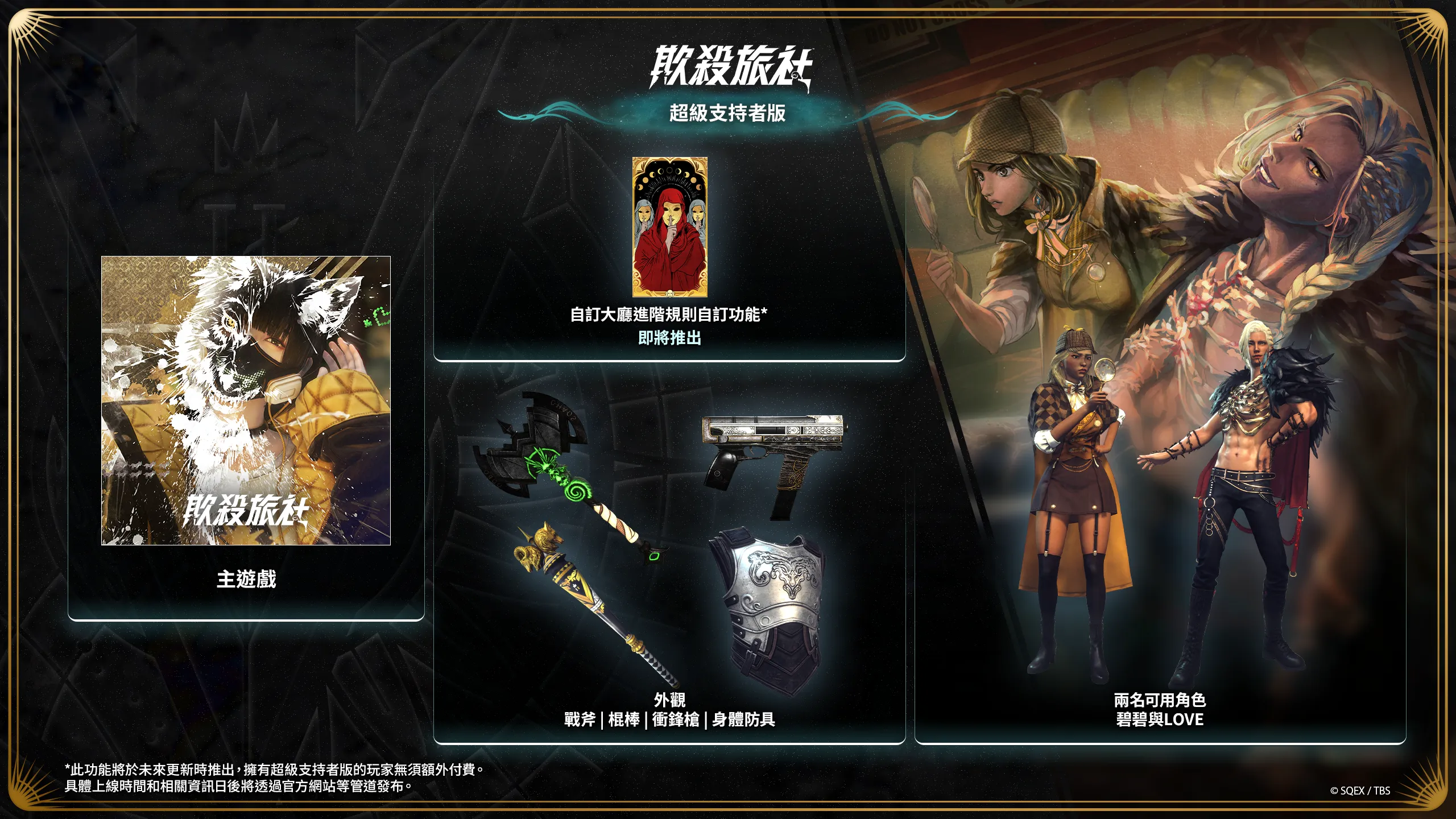 《欺殺旅社》超級支持者版包含以下內容: 《欺殺旅社》主遊戲 自訂大廳進階規則自訂*1 蝕相典藏系列外觀 棍棒 身體防具 神器造型 戰斧 衝鋒槍 可操控角色*2 偵探碧碧 連環殺手 LOVE *1 此功能將於未來更新時推出,擁有超級支持者版的玩家無須額外付費。具體上線時間和相關資訊日後將透過官方網站等管道發布。 *2 偵探碧碧和連環殺手 LOVE 會在日後隨著遊戲進展而解鎖。