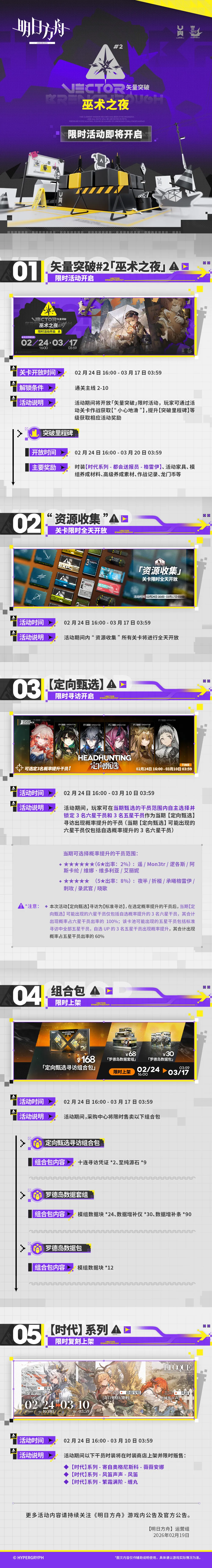 一、矢量突破#2「巫术之夜」限时活动开启 二、“资源收集”关卡限时全天开放 三、【定向甄选】限时寻访开启 四、组合包限时上架 五、【时代】系列,限时复刻上架