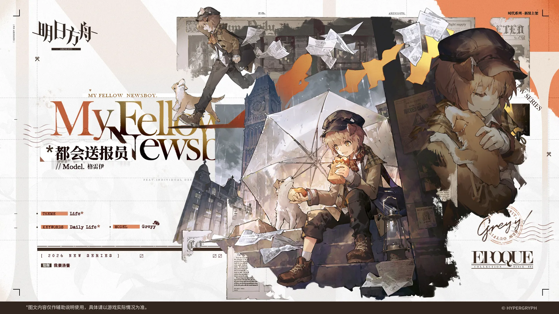 【活动奖励服饰】 //都会送报员 - 格雷伊 EPOQUE系列新款/都会送报员。格雷伊派送报刊时的着装。耐磨外衣配上厚实靴子,再裹一条格子围巾,就足以让他在穿越广场与小巷时无惧风雨。 _____________ 系好鞋带,按住帽檐,与紧紧跟随自己的幼兽伙伴同享生活的冷暖。