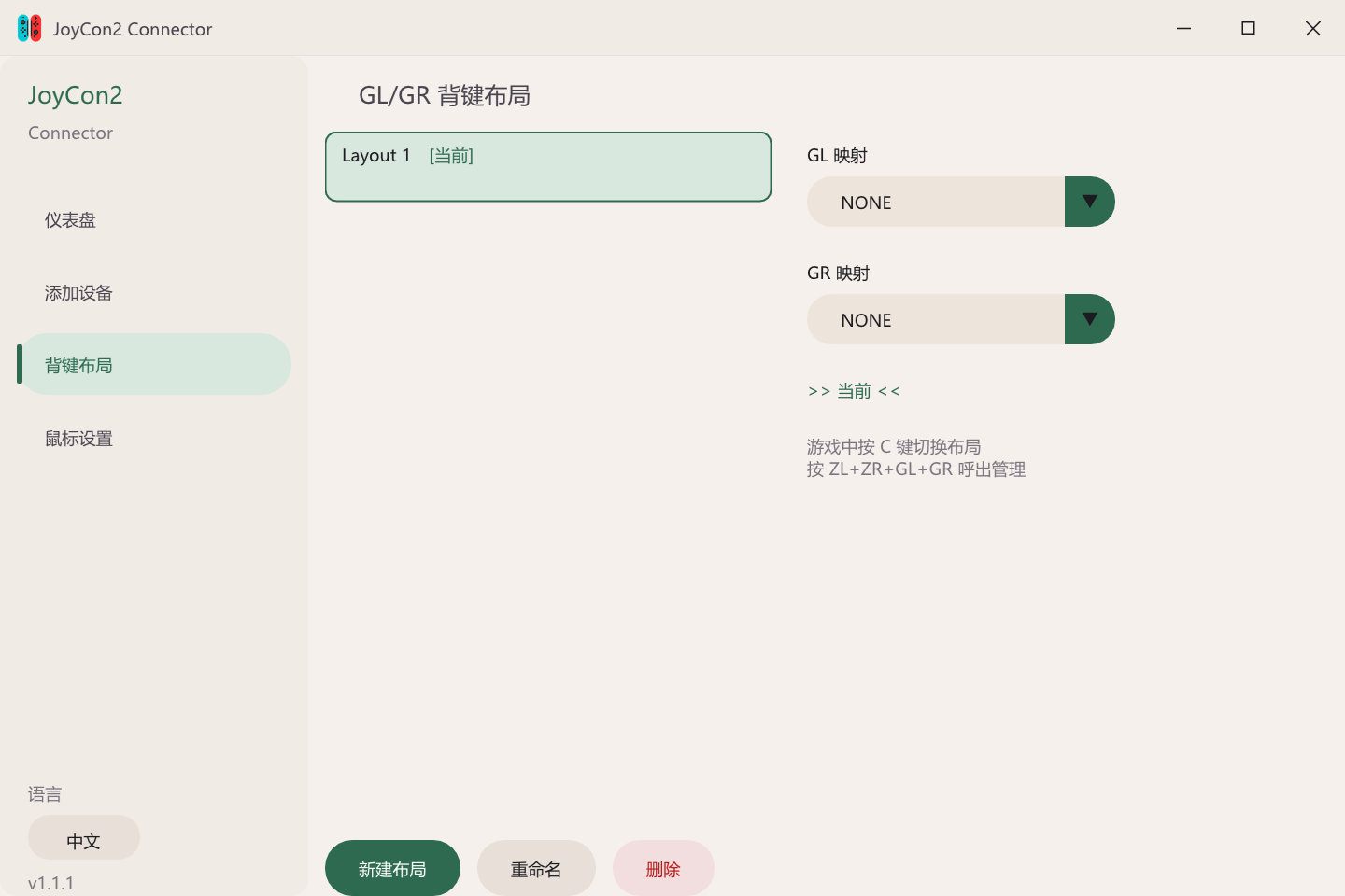 在背键布局页面可为 GL 和 GR 键分配任意按键。支持创建多个命名布局,游戏中按 C 键可快速切换布局,按 ZL + ZR + GL + GR 可呼出布局管理界面。