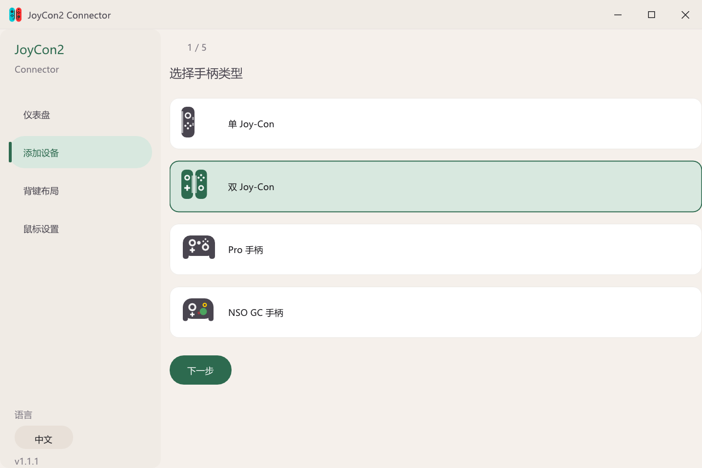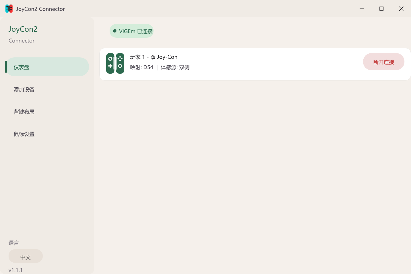 连接错误/无法连接:请确保手柄是关机状态,开始扫描后再按住配对键让它开机,连接成功后再松开配对键。 手柄多次尝试连接后无响应:这是手柄本身的冷却行为,并非系统或蓝牙驱动问题。等待几分钟后重试即可自动恢复。 ViGEm 未检测到:请在启动程序前确认 ViGEmBus 驱动已正确安装。仪表盘顶部的状态指示灯为绿色即表示连接正常。 左右 Joycon 的按键布局不同:设置时请务必正确选择左/右侧。