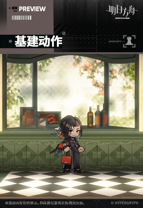 【活动奖励服饰】 //三元风情 - 红隼 EPOQUE系列新款/三元风情。红隼在棋牌茶室游玩时的穿着。布面裙裤搭配皮衣与手包,引出雅致魅力的同时,尽显穿戴者洒脱风范。 _____________ 这还是她第一次接触这种独特的游戏,点一壶茶,坐下来向她传授以牌会友的基本技巧吧。 > 基建动作 点击隐藏 > 战斗动作 点击隐藏