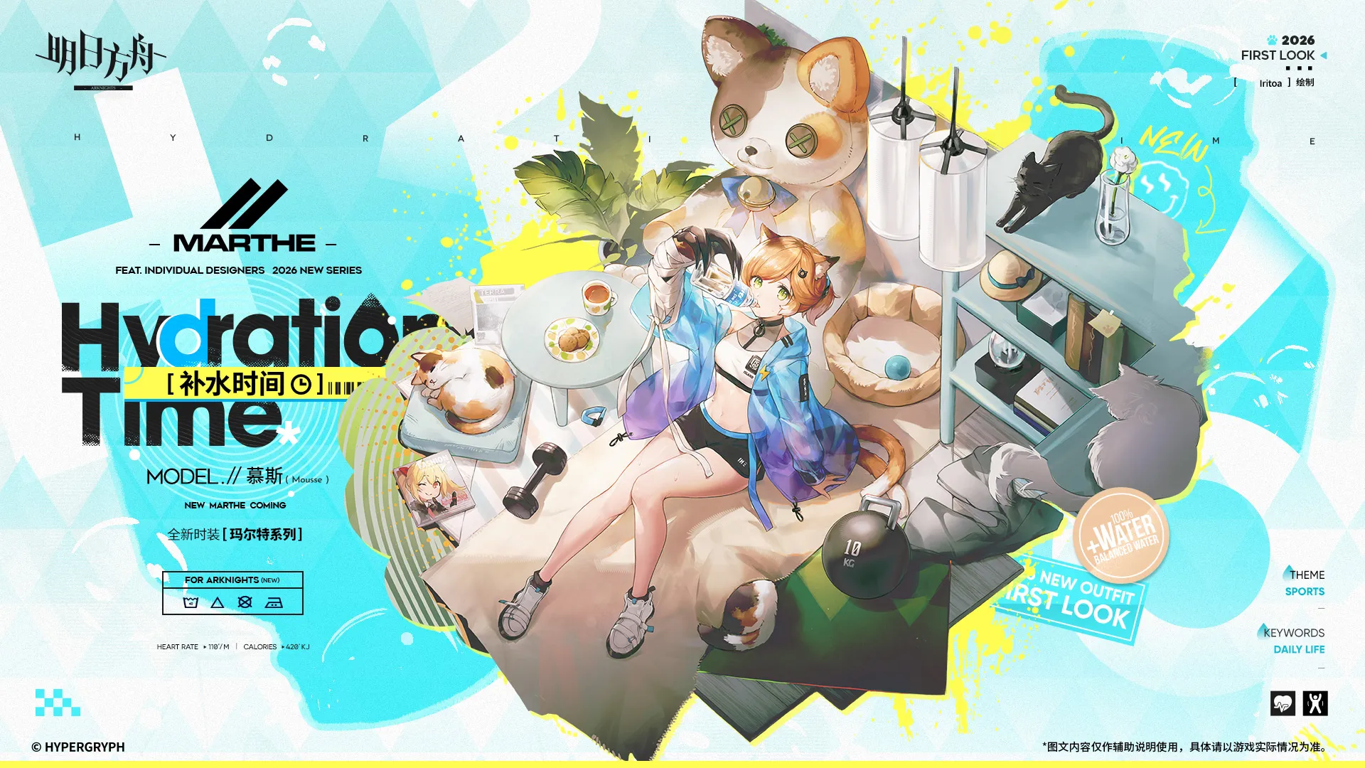 【活动奖励服饰】 //补水时间 - 慕斯 MARTHE运动系列新款/补水时间。为健身爱好者特别设计的运动装束,采用轻薄透气面料,锻炼时能感受到前所未有的舒适与轻松。 _____________ 组间补充些水分就好,做完全部运动,再去享受桌上的甜美曲奇作为奖励吧! > 基建动作 点击隐藏 > 战斗动作 点击隐藏