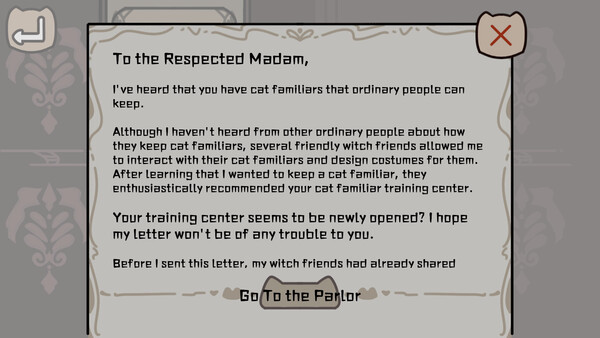 《猫咪使魔培养中心》是一款氛围轻松的养猫游戏。玩家将扮演一名女巫,在女巫同伴的帮助下,培养出不同的猫咪使魔,并为培养出的猫咪使魔寻找合适的新家。