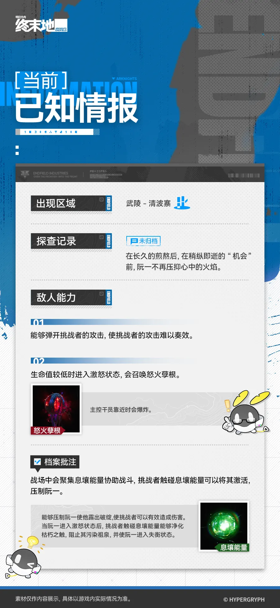 管理员您好,以下为您整理了敌人「阮一」当前已知情报。 在长久的煎熬后,在稍纵即逝的“机会”前,阮一不再压抑心中的火焰。 > 长图 点击隐藏