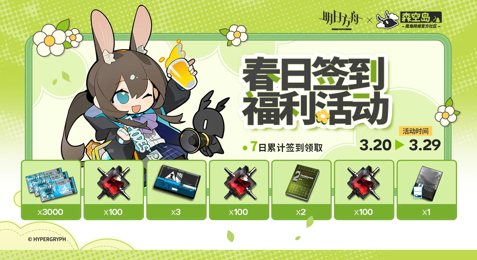 【活动时间】 2026年3月20日-2026年3月29日 【参与方式】 活动期间,前往森空岛《明日方舟》版区,点击「签到福利」图标进入每日签到页面,完成每日签到,可额外获得对应累计签到天数的奖励。 ※活动期间,每日签到奖励和春日活动签到奖励可同时获取,无需重复签到。 【活动奖励】 累计签到7日可额外获得合成玉*300、初级作战记录*3、技巧概要卷2*2、龙门币*3000、招聘许可*1。 【奖励领取】 签到成功获得的奖励,将直接发放至当前绑定角色的游戏内邮箱,邮件有效期为30天,请及时领取。
