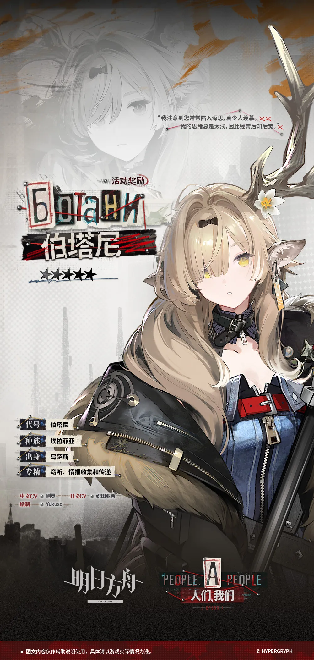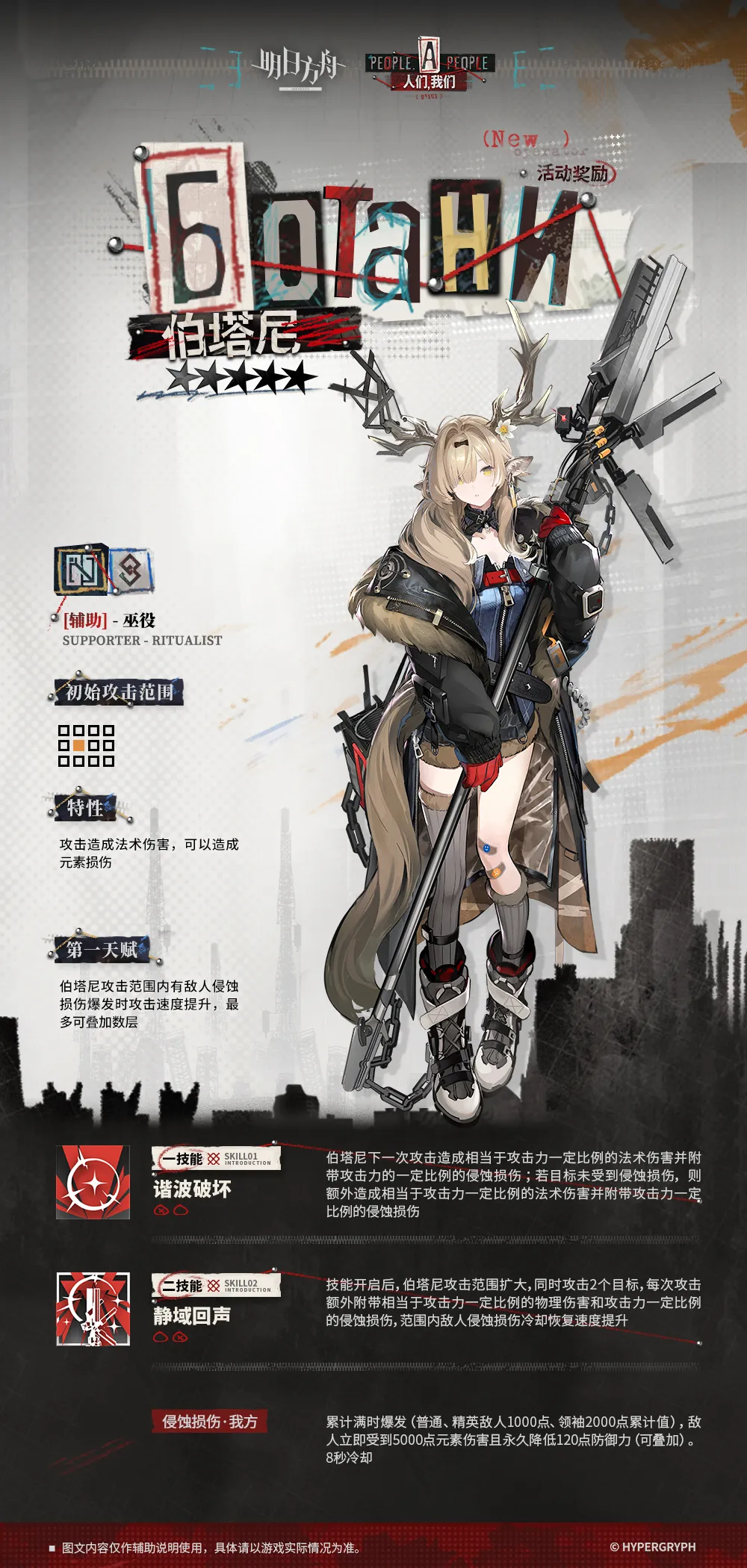 【活动奖励干员】 //伯塔尼 “博士,我记得您,罗德岛加密信号里那个高频出现的特殊波形。您叫我伯塔尼就好,我习惯了别人这样叫我。‘书呆子’,我将它理解为一种夸奖。” > 基本信息 点击隐藏 > 基建动作点击隐藏 > 战斗动作 点击隐藏