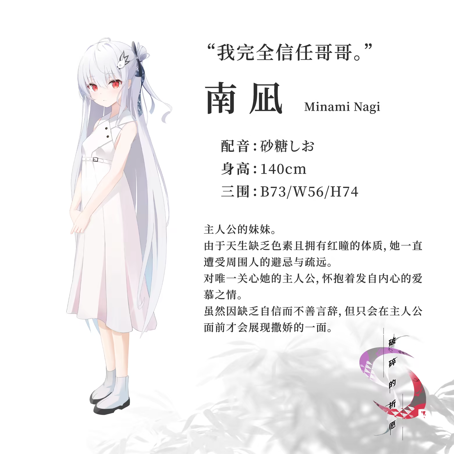 实妹相伴的短篇纯爱视觉小说。 一篇讲述在乡间田野中,兄妹为了拯救家人,不断违背“祈愿”的温馨故事。
