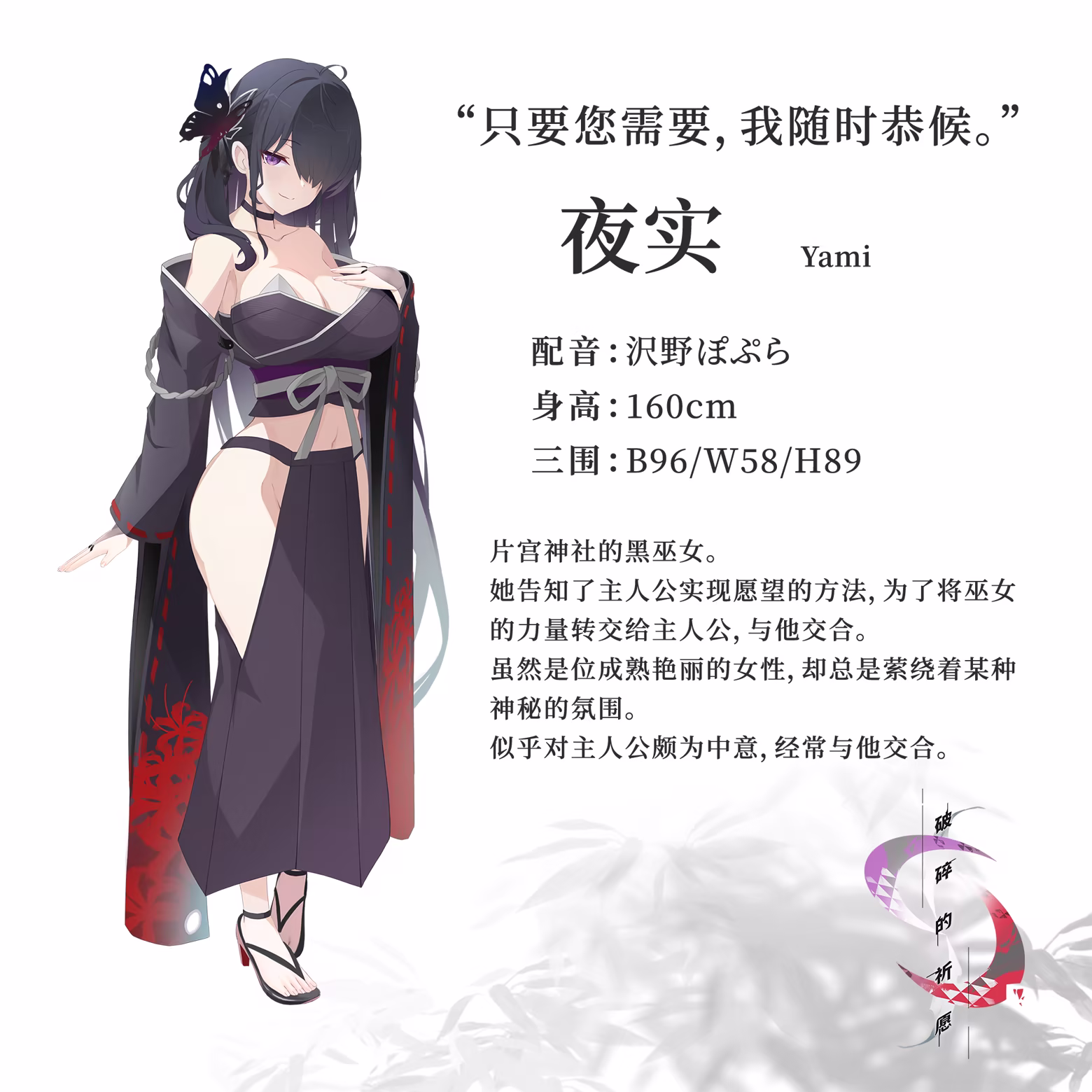 得知父母离世的消息后,南家的兄妹回到了曾经生活过的偏僻村庄。 村中几乎已无人居住,成唖与凪在寂静中相依为伴,过着平静的日子。 然而,凪的身体状况却逐渐恶化。为了寻找治疗妹妹的办法,成唖前往村中的神社,并在那里邂逅了一位神秘而诡异的黑巫女——夜实。 为了拯救至亲,夜实向成唖传达了一个违背常理的“选择”。 这是一个为了拯救你所珍视之人,践踏愿望、并将其实现的故事—— 制作人员 剧本原案・剧本 都湖南 原画・角色设计 ドルゾ~ 片头曲 “ネガイ” 演唱:nayuta 作词、作曲、编曲:cittan*(Sprite Recordings) 片尾曲 “カタネガイ” 演唱:神田佐知 作词:都湖南 作曲、编曲:あーるず