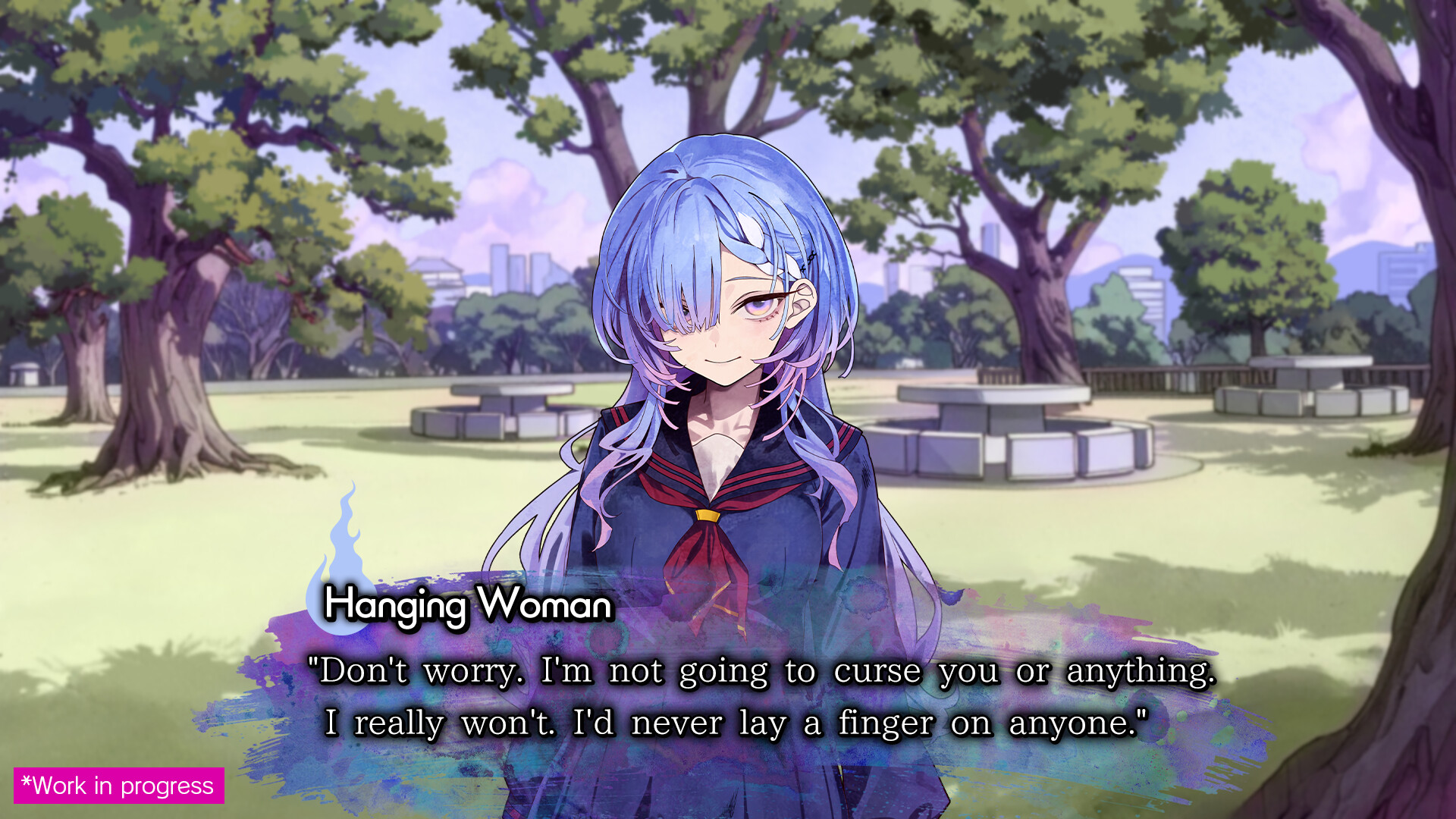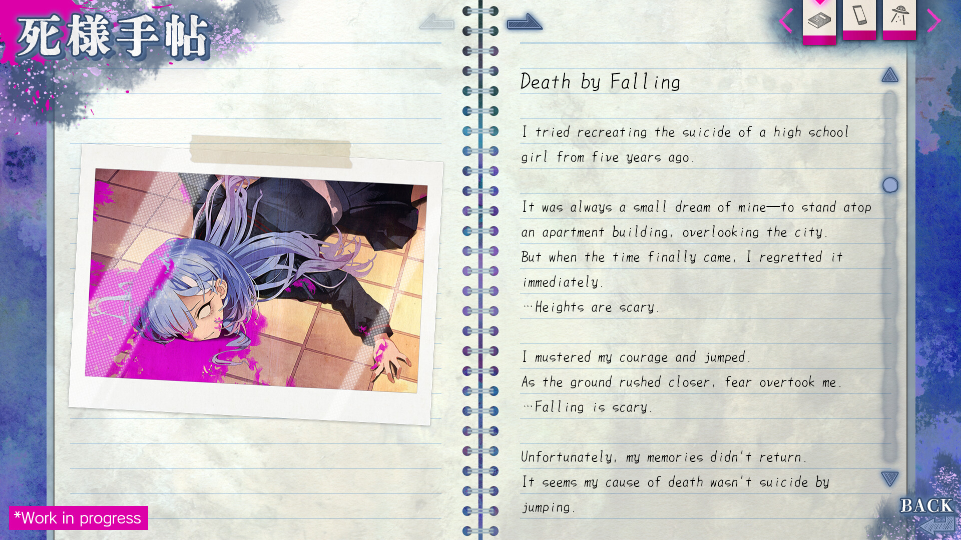 本作是一款以灵异喜剧为主轴的恐怖悬疑视觉小说。讲述了以轻率的态度不断重复自杀的幽灵久我山栞,追寻自己的死因与未了执念的故事。而在最终揭开的那起事件中,隐藏着她死亡的真相——